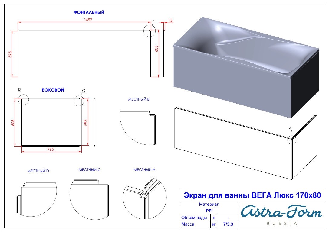 Ванна Astra-Form Вега Люкс 170x80 пустая, литой мрамор, белая глянцевая, 01010003