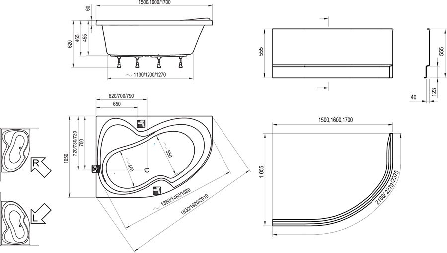 170 на 105 см – это королевская геометрия для тех, кто отказывается от компромиссов. Угловая форма с левым расположением (L) позволяет эффективно использовать пространство комнаты, а ширина 105 см – это на 30 см больше стандартной ванны. Объём 210 литров создаёт глубокое, окутывающее погружение, где вода доходит до плеч даже при полном расслаблении. Материал – литьевой акрил с армированием LA. Это не просто прочность – это тёплая, гладкая поверхность, которая не холодит, не скользит и не желтеет со временем.