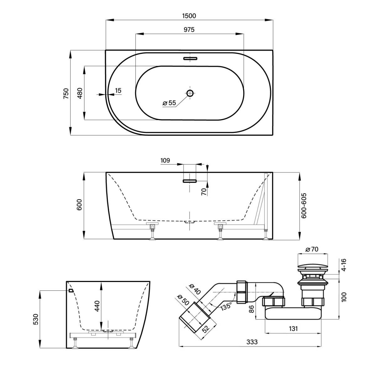 Её 150 на 75 см – это идеальный формат для смелого дизайнерского жеста. Комплектация «4 в 1» с матовой чёрной системой слива-перелива 231924000 – это не просто набор, это готовый, завершённый образ. Правостороннее расположение слива становится не технической деталью, а частью композиции, где чёрный акцент ставит графическую точку в белом пространстве, задавая чёткий, современный ритм.