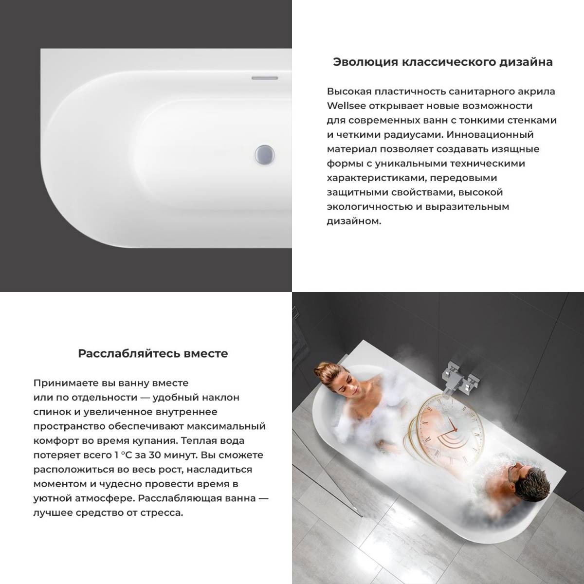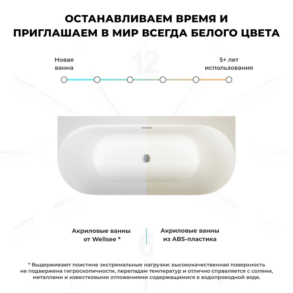 В её белизне читается уверенность качества. Литьевой акрил CastAcryl с двойным армированием обеспечивает прочность, которая служит десятилетиями, оставаясь такой же белоснежной и гладкой. Это не просто материал – это гарантия того, что ощущение нового комфорта будет с тобой год за годом, превращая каждое купание в маленький спа-ритуал.