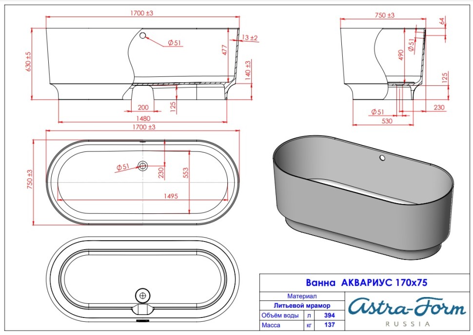 1700 на 750 мм – это выверенная классическая геометрия, обеспечивающая комфортное размещение. Овальная форма отдельностоящей ванны Аквариус – это элегантное решение, которое органично вписывается в современный интерьер. Материал – литьевой мрамор толщиной стенок 13 мм. Это монолитная структура с высокой теплоёмкостью: вода в такой ванне остывает значительно медленнее, чем в акриловой. Объём 394 литра и глубина 490 мм позволяют полностью погрузиться в воду, создавая глубокое, окутывающее ощущение релакса.
