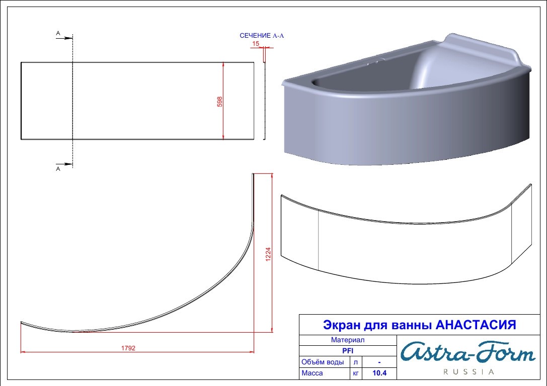 Ванна «Анастасия» Длина: 1820 +/- 5 мм Толщина стенок: 15 +/- 2 мм Объем: 370 л Ширина: 1250 +/- 3 мм Масса: 129 кг Высота: 775-800 +/- 10 мм Глубина ванны: 470 мм Литой мрамор – композитный материал серого цвета, покрытый внешним защитным слоем – гелькоутом. Обычно, имеет глянцевую поверхность. Возможна реставрация. Установочные ножки входят в стоимость ванны.