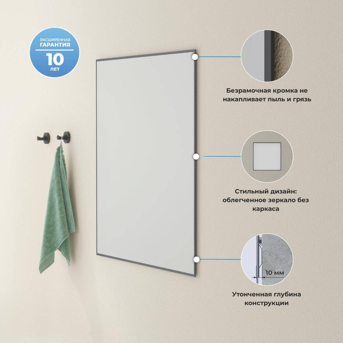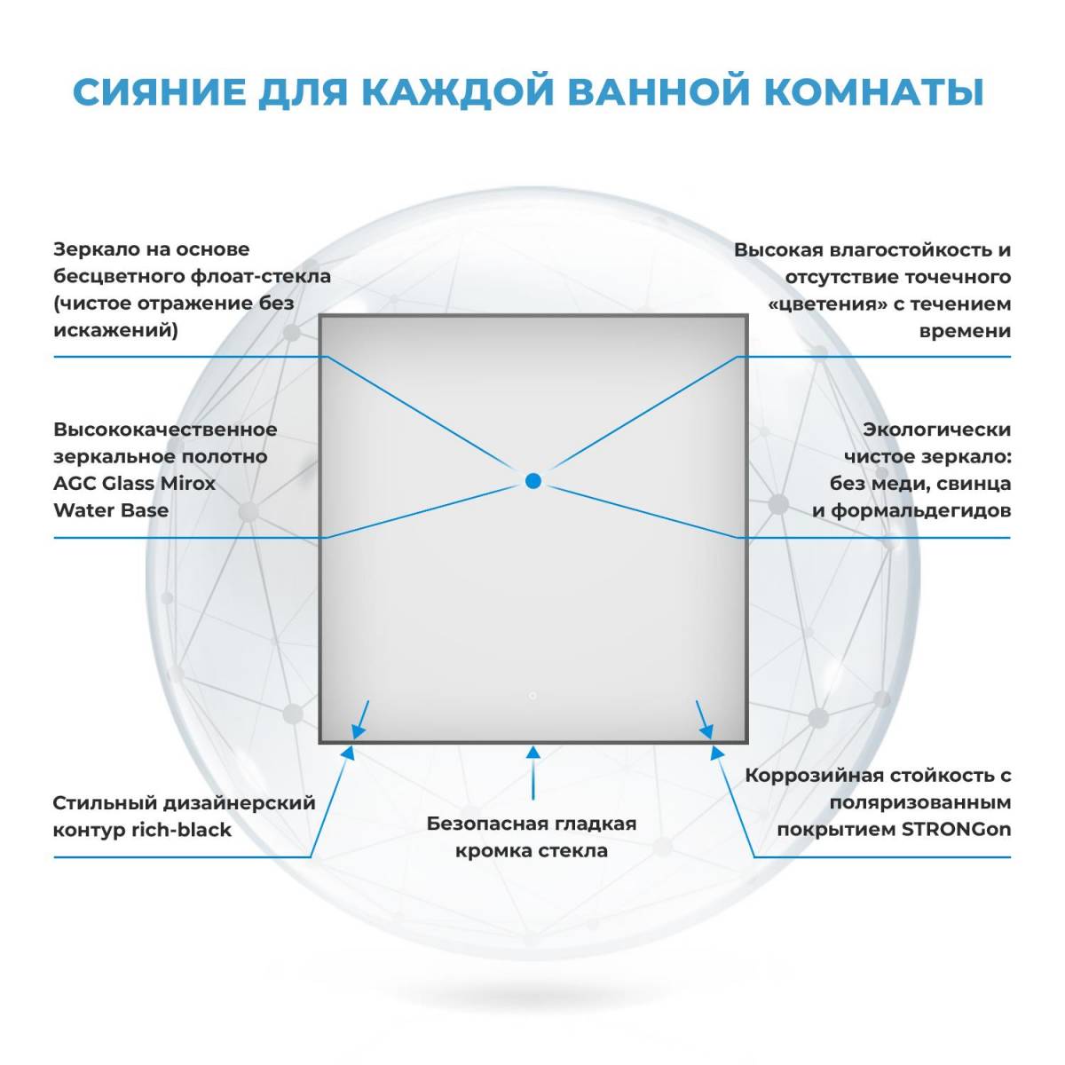 В его строгой квадратной форме читается уверенность. Японское флоат-стекло – это не просто материал, это эталон. Бесцветная основа, серебряная амальгама, поляризованное покрытие STRONGon – это формула вечной молодости для твоего отражения. Контур rich-black, нанесённый УФ-чернилами, – это не краска, а молекулярная связь, которая не отвалится и не потускнеет. Без меди, без свинца, без формальдегидов – это экология, которой ты доверяешь своё первое утреннее мгновение.
