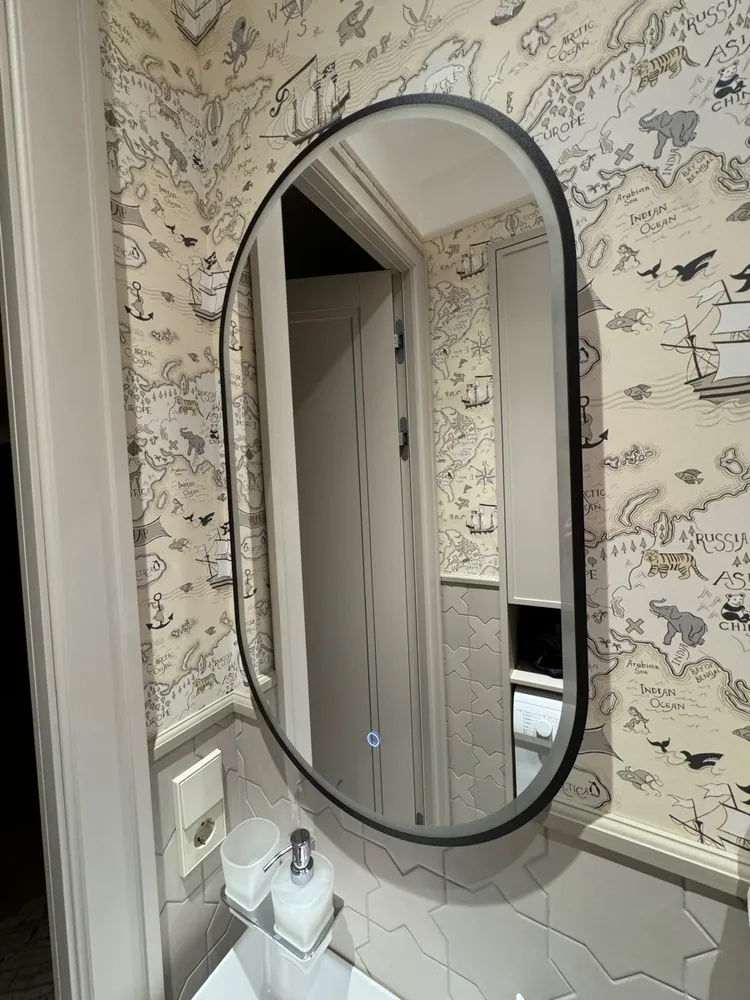 Когда вечером вы выключаете свет, сенсорная кнопка запоминает уровень яркости для следующего утра. Функция плавного диммирования позволяет настроить освещение под любое настроение и задачу – от яркого макияжа до расслабляющего вечернего ритуала. Овальная форма, чёрный контур, бесшумная работа – это формула пространства, где внешность встречается с внутренним спокойствием.