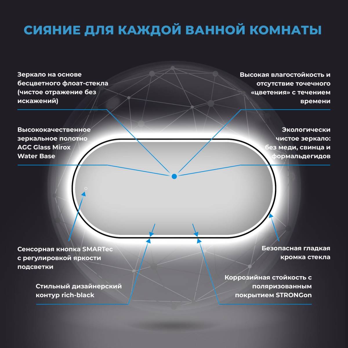 Его овальная форма 90×50 см – это геометрия, которая смягчает пространство и обволакивает отражение. Чёрный контур rich-black – не рамка, а графический акцент, который подчёркивает безупречность японского стекла AGC Glass Mirox 3G. Сенсорная кнопка с функцией диммирования – это волшебный переключатель между реальностью и идеальным светом для вашего ритуала красоты. Это зеркало не просто отражает – оно преображает, создавая ту самую картину, которую видят окружающие.
