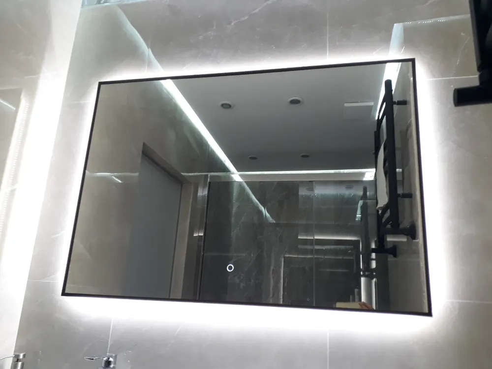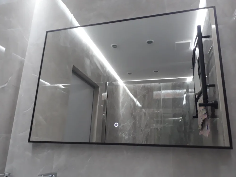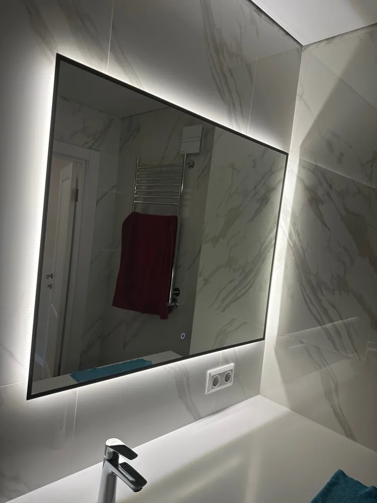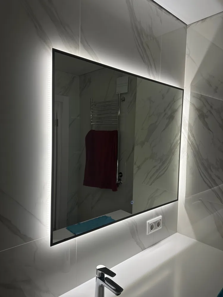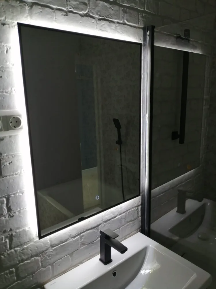 Его прямоугольная форма 50×70 см – это геометрия уверенности. Чёрный контур rich-black – не рамка, а элегантное тире между вами и миром, подчёркивающее чистоту линий и статус интерьера. Сенсорная кнопка с регулировкой яркости – это ваш личный световой режиссёр: одним касанием вы создаёте атмосферу от мягкого утреннего пробуждения до идеального студийного света для безупречного макияжа.