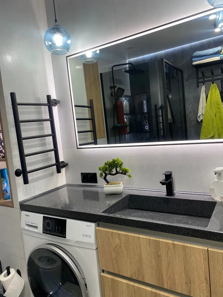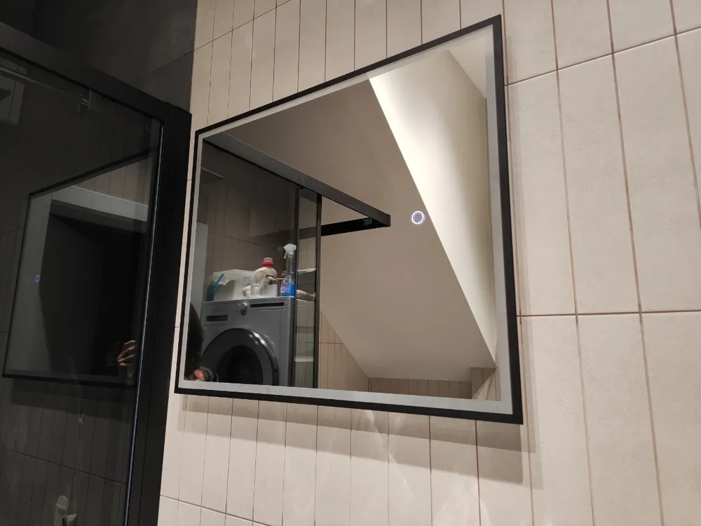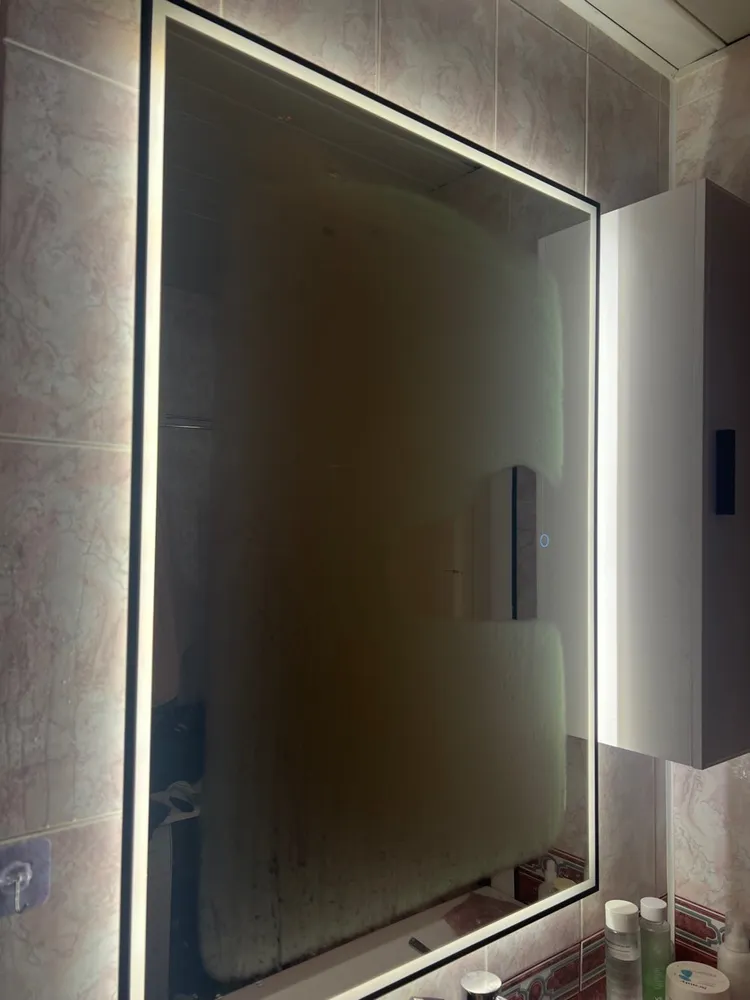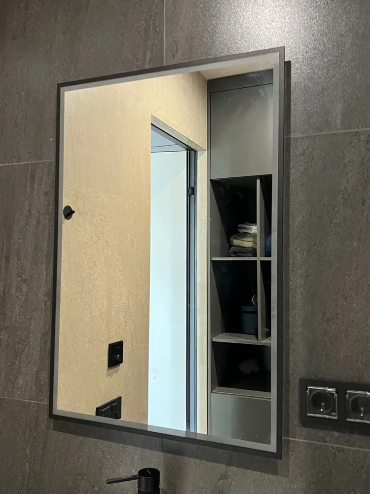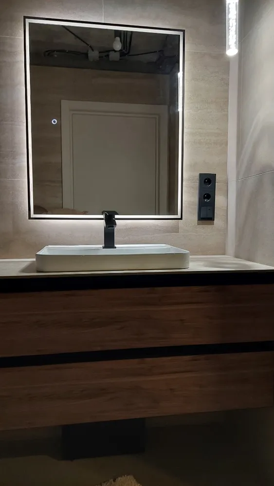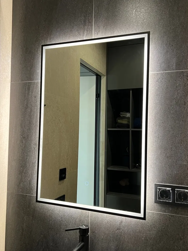Его 55 на 70 см – это холст для твоего ежедневного ритуала. Чёрный контур rich-black – не просто рамка, это графический акцент, который завершает композицию интерьера, превращая зеркало в дизайнерский объект. Сенсорная кнопка с памятью яркости – это тихий диалог между тобой и светом: лёгкое касание включает мир без теней, долгое прикосновение настраивает атмосферу.