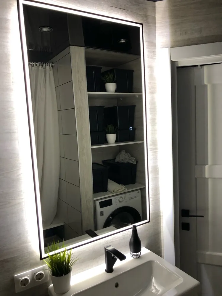 Его 80×55 см – это пропорции диалога. Не маленькая щель, не громоздкая панель, а идеальный прямоугольник для контакта. Ты стоишь перед ним – и всё пространство принадлежит тебе и твоему отражению. Тонкий черный контур – это не рамка, это графическая подпись на полотне твоего утра. Это рамка, которая не ограничивает, а акцентирует внимание на главном – на тебе. Сенсорная кнопка – это мост между тобой и технологией: одно прикосновение, и пространство наполняется идеальным светом.