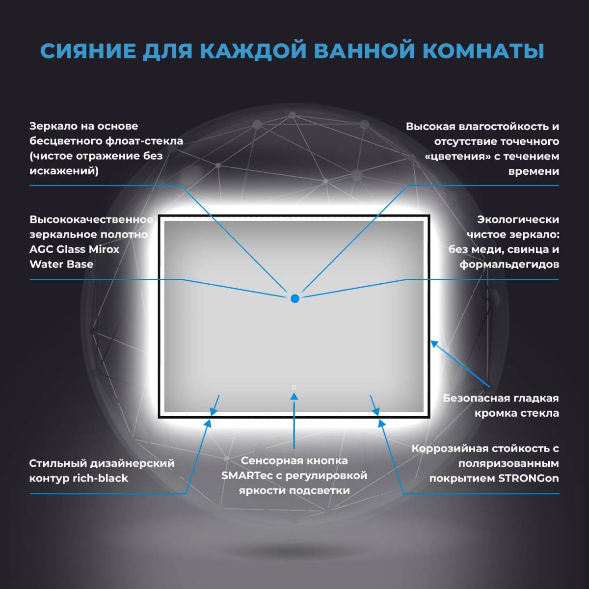 Его 90×70 см – это площадь для диалога с собой. Чёрный контур – не рамка, а графическое тире между тобой и миром, стильный акцент, который говорит о твоём вкусе без единого слова. Фронтальная подсветка – это магия, превращающая ежедневный ритуал в момент профессионального ухода: никаких теней, никаких искажений, только чистая правда в самом выгодном свете. Сенсорная кнопка – это тихий союзник, который включает атмосферу одним касанием.
